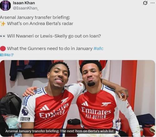 此外,卖人方面,预计阿森纳不会在冬天出售任何一线队球员。斯凯利渴望跟随英格兰出征世界杯,但这名新星并没有对目前的情况感到不愉快,而租借被认为“可能性微乎其微”。