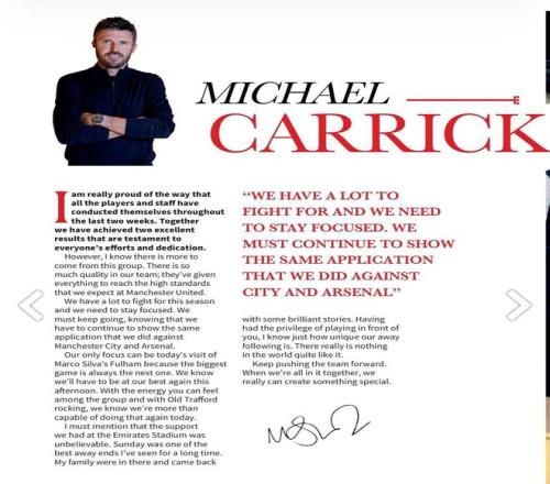 曼联取得两连胜后排名英超第四,但切尔西和利物浦本轮取胜后,已经暂时超越红魔,卡里克和他的球队必须在剩余15场比赛取得好结果,才能确保重获欧冠资格。卡里克并未因为接连击败强队而沾沾自喜,他知道马尔科·席尔瓦的富勒姆会带来与瓜迪奥拉的曼城、阿尔特塔的阿森纳不同的挑战。