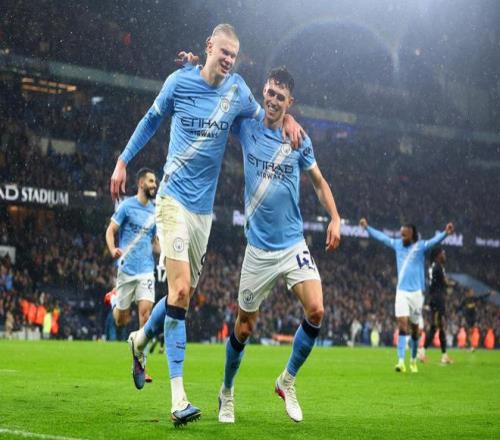 福登(右)在本场比赛为哈兰德(左)送出助攻,打进了“杀死比赛”的一球。