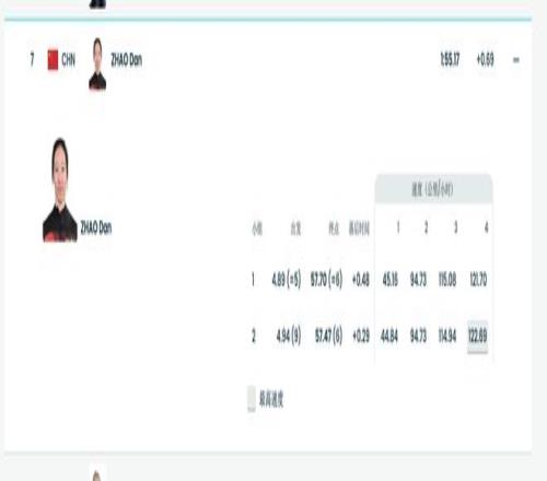 随着比赛的进行,在后面的弯道赵丹没能保持之前的速度,最终以57秒70的成绩结束了第一轮比拼,在所有选手中排名第六。第二轮比赛,赵丹提升了自己的成绩滑出57秒47,总成绩位列第七名。