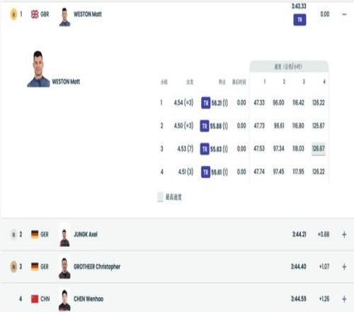前三轮比赛结束后,中国选手陈文浩排名第四,距离身前选手的总时长差距为0.17秒,殷正排名第七,林勤炜排名排名第九。最后一轮较量,陈文浩滑入56秒以内,以55秒95完赛!以总成绩0.19秒之差,最终获得第四名。