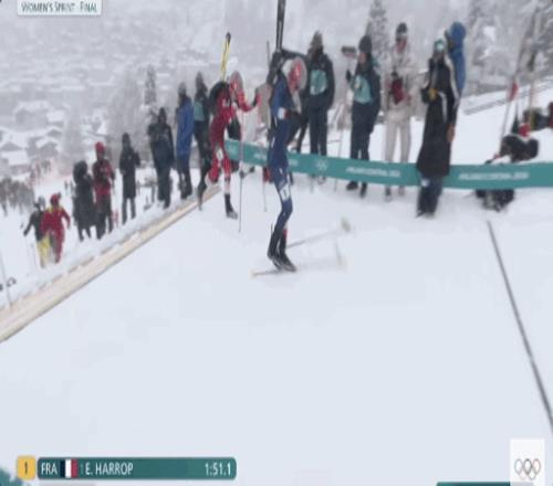 世锦赛三冠王、身穿蓝衣头戴灰粉色头盔法国名将埃米莉·哈罗普无疑是女子短距离比赛的夺冠最大热门,第一赛段和第二赛段的配速都遥遥领先,但是在转换区穿板时她出现了明显失误,被瑞士选手、世锦赛双冠王,身穿红衣脚踩黄色雪板的玛利亚内-法顿超越。